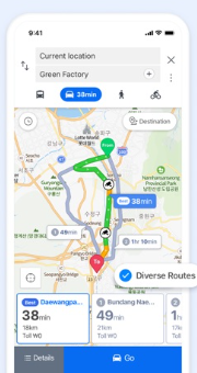 Both Korean map apps offer integrated subway and bus schedules, with arrival times, fare info, and optimal routes. Google Maps lacks this completely.